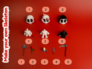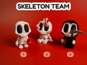Skeleton Team (3) — rose-bearing skeleton, silly skull, reaper in cloak.