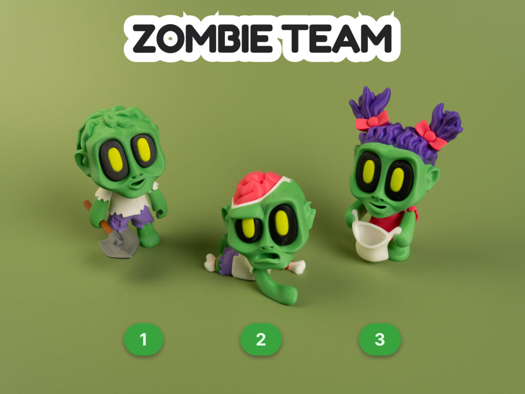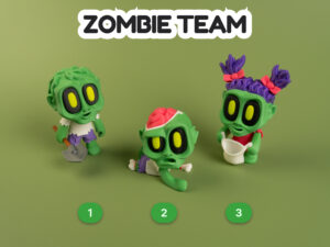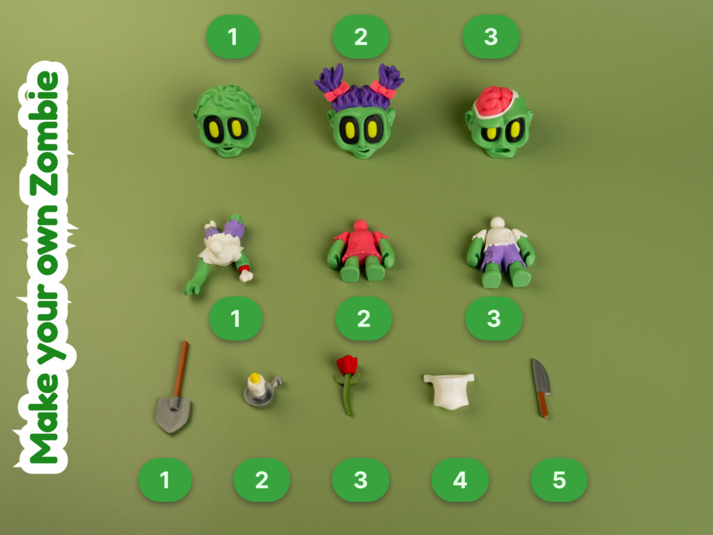 Zombie Team (3) — three mixable heads and bodies, plus accessories.