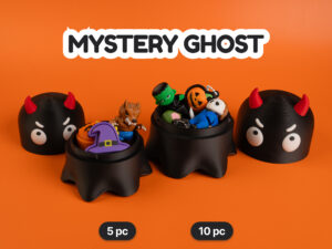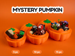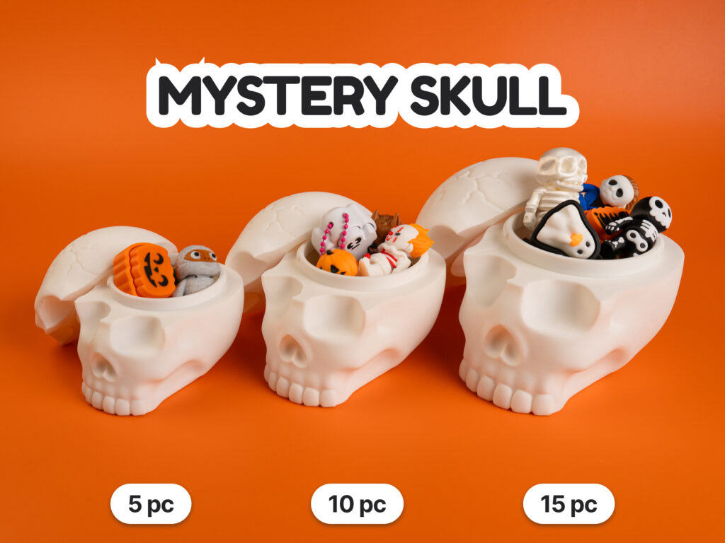 Halloween mystery box packed with clickers, keychains, and mini figures. Choose Pumpkin, Skull, Ghost or Bag and 5/10/15/25 pieces for a thrilling unboxing.