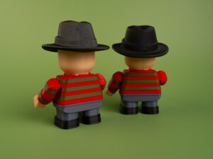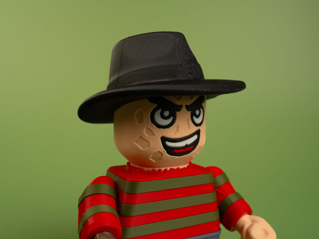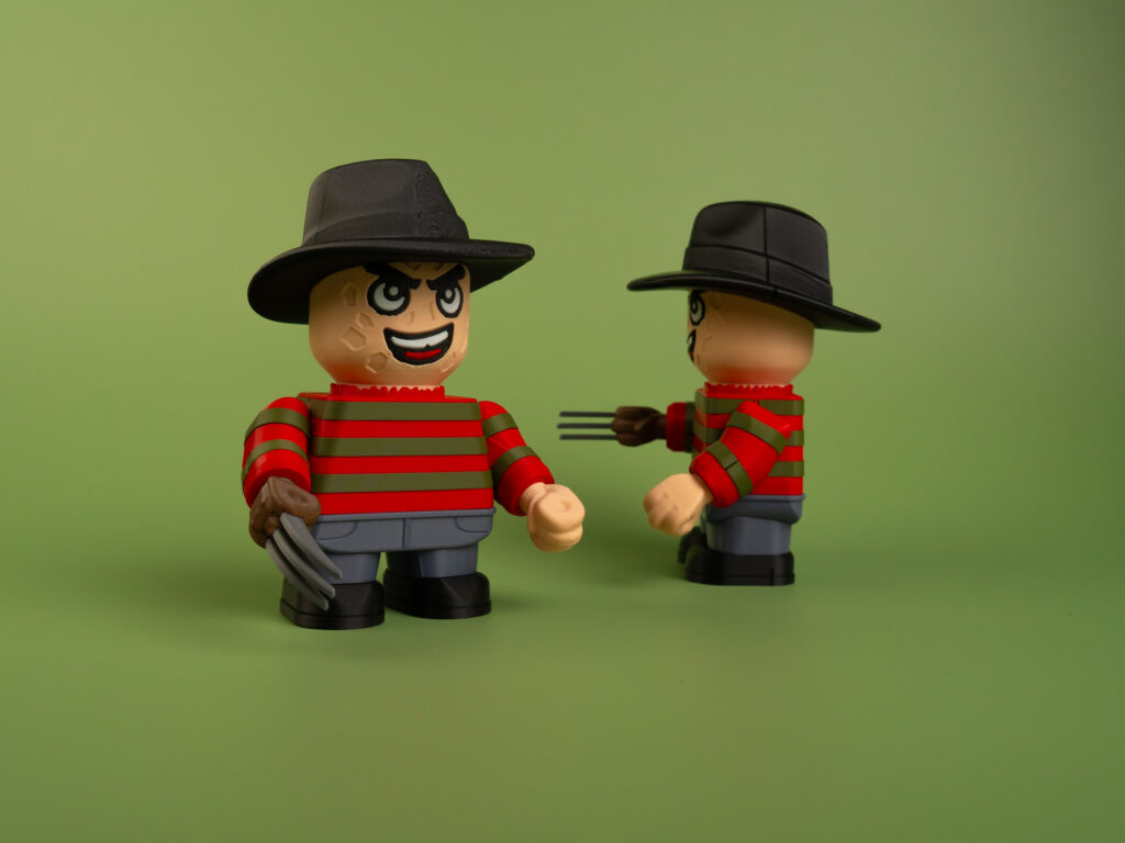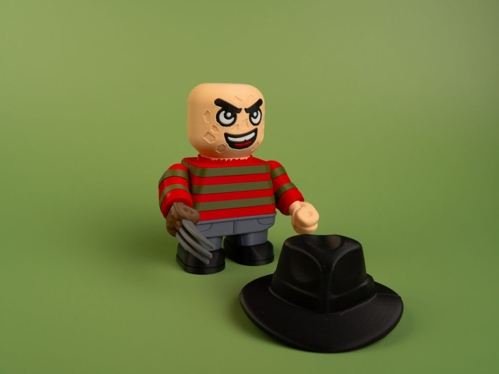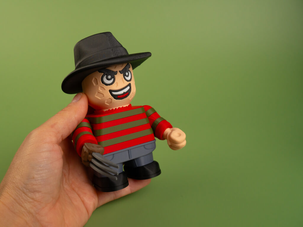 Nightmare slasher figure in two sizes—17 cm or 12 cm. Poseable head and hands, sharp details, and eco-friendly PLA create a chilling desk collectible for horror fans.